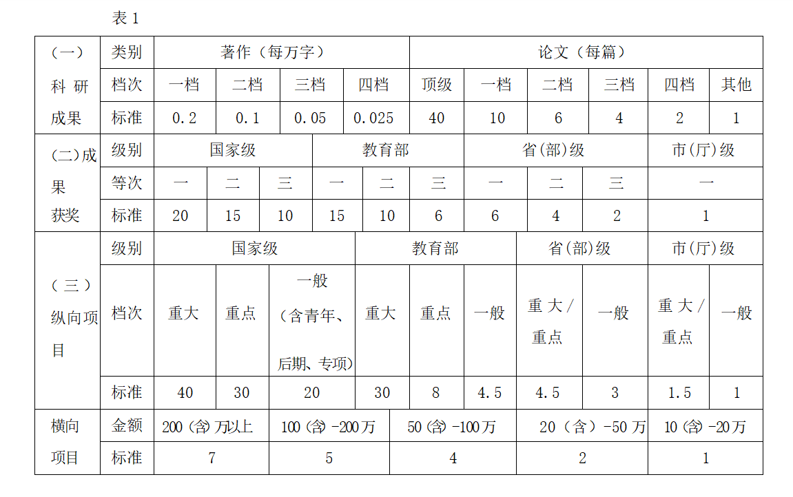 附加分包括论文、著作、项目、成果奖励、学科竞赛获奖、职(执)业能力等计分项目,论文、著作、项目、成果奖励等科研计分仅限于本专业的研究成果,且在评审周期(即上年9月至本年8月份,下同)内获得。量化指标见表1:
