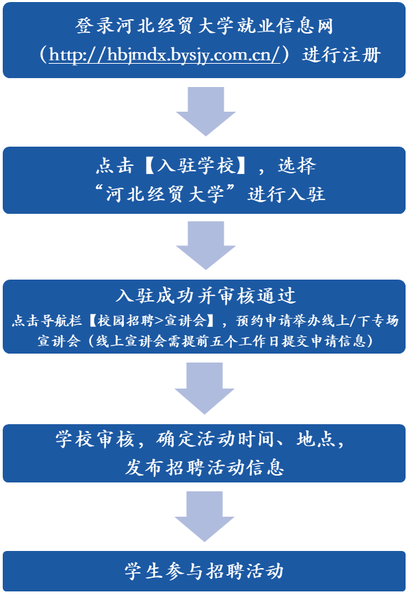用人单位可登录365英国上市公司就业信息网(http://hbjmdx.bysjy.com.cn/)进行注册,点击【入驻学校】,选择“365英国上市公司”进行入驻,入驻成功并审核通过后,点击【校园招聘>在线招聘】宣传发布本单位网络招聘信息。